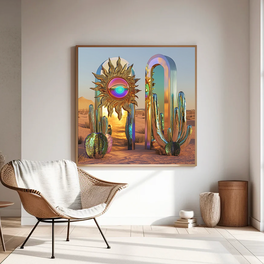 El marco no está incluido. Para saber más sobre las diferencias entre el papel Fine Art, el plexiglás y el Dibond, visita la página de Materiales de nuestro sitio web.