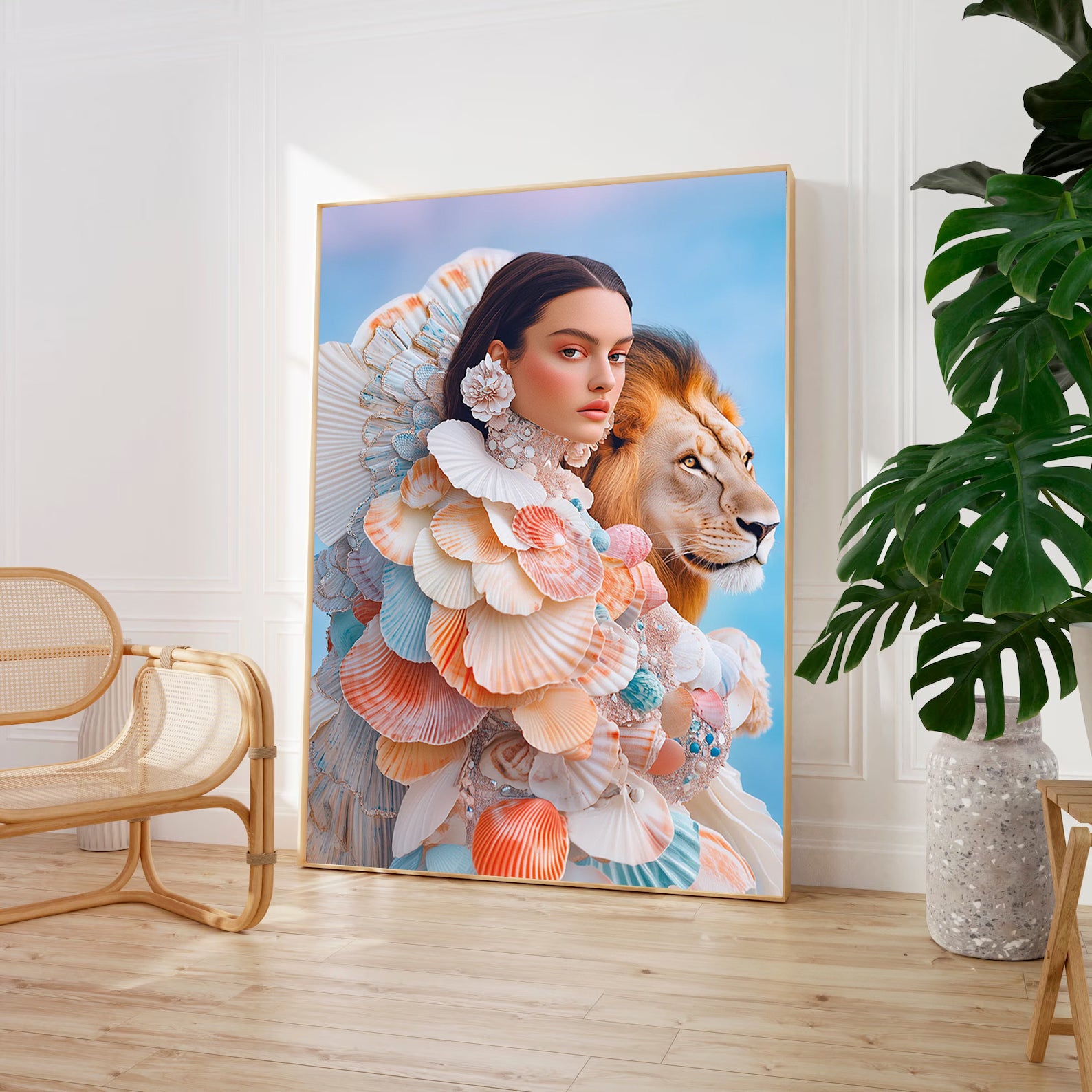 Tanit, déesse d'Ibiza, incarne la nature, la fertilité et la protection. Chaque soir, son regard intense illumine l'horizon, tandis que le lion, symbole de force et de courage, marche à ses côtés. Ensemble, ils veillent sur un royaume où la vie et la magie s'entremêlent, rappelant la puissance sacrée qui imprègne l'île, éternelle et inébranlable.