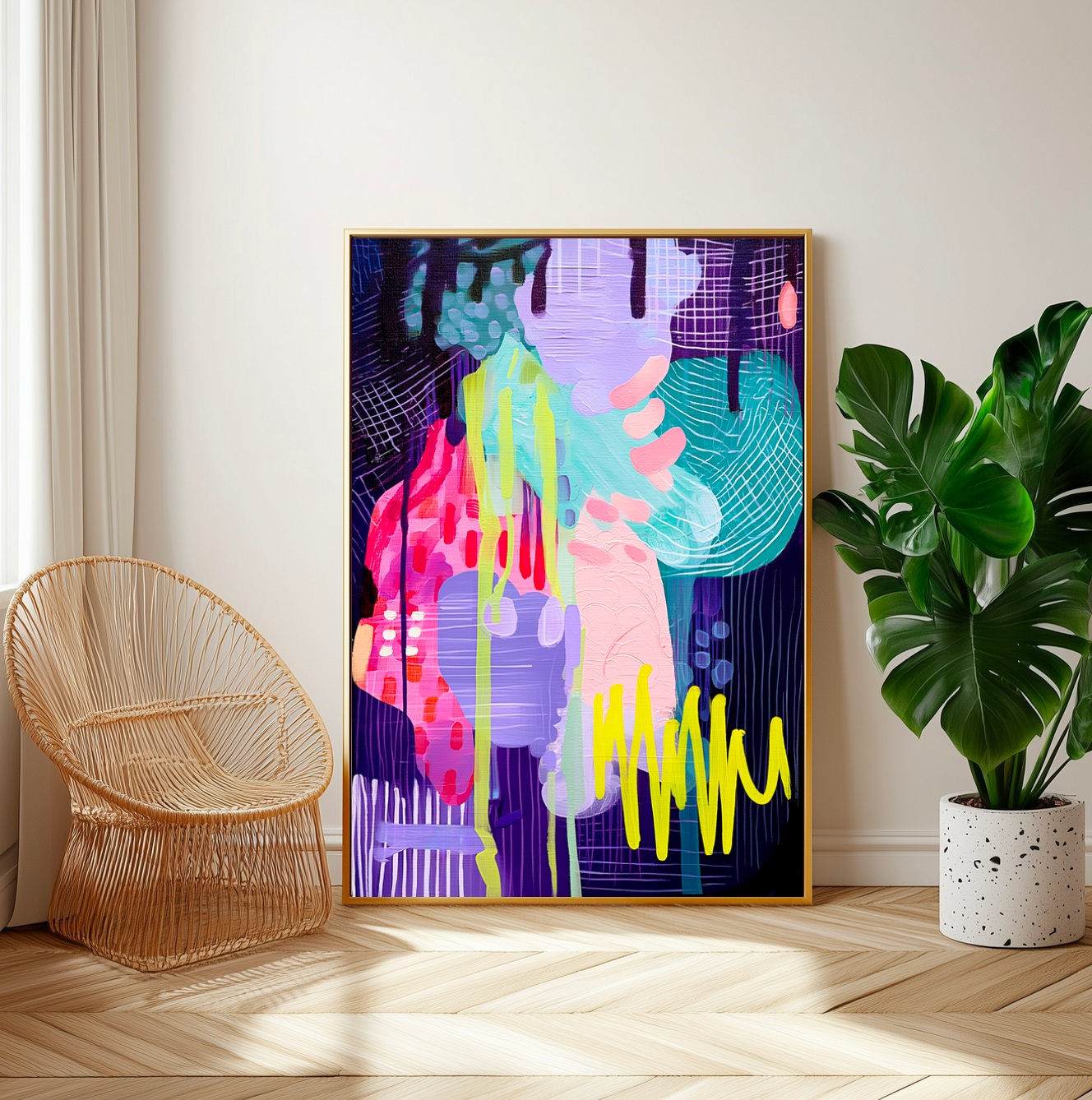 This abstract piece bursts with the carefree energy of Ibiza, all sunshine, music, and movement. Splashes of neon color dance across the canvas like beats in a summer night set. Fuchsia pinks, electric blues, and glowing yellows collide in a joyful rhythm, echoing the island’s sunsets, beach parties, and the shimmer of the sea under the moonlight. It’s pure Ibiza, bold, bright, and beautifully alive.