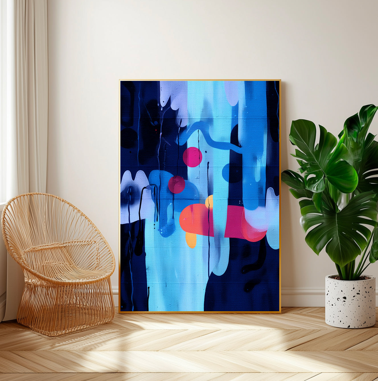 This abstract piece bursts with the carefree energy of Ibiza, all sunshine, music, and movement. Splashes of neon color dance across the canvas like beats in a summer night set. Fuchsia pinks, electric blues, and glowing yellows collide in a joyful rhythm, echoing the island’s sunsets, beach parties, and the shimmer of the sea under the moonlight. It’s pure Ibiza, bold, bright, and beautifully alive.