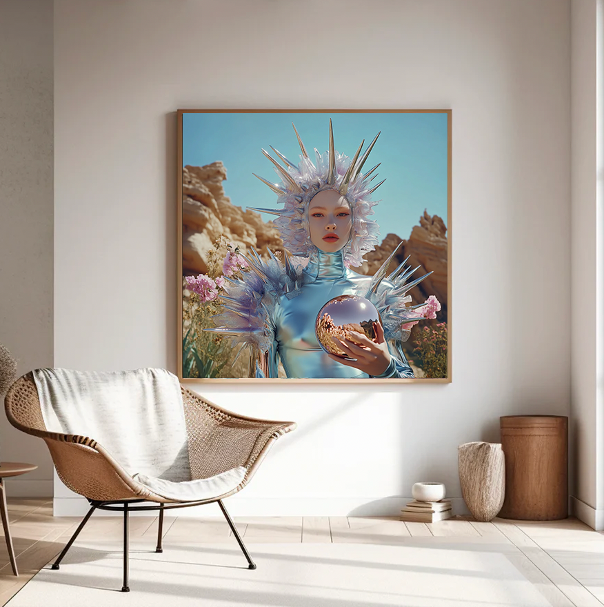 Holding mirrored spheres, they reveal a world suspended between celebration and serenity, modernity and tradition. Born of music and night, they stand as silent witnesses to the eternal rhythm of trance and stillness—where ecstasy and spirituality become one.