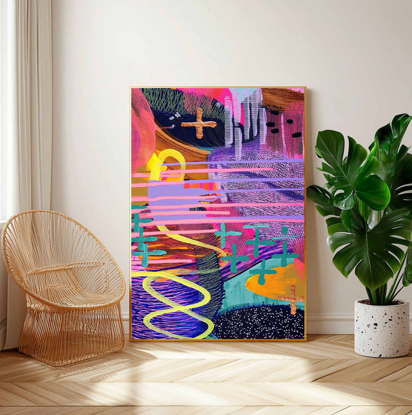 This abstract piece draws inspiration from the vibrant, sun-soaked energy of Ibiza. Through an explosion of fluorescent hues and free, expressive gestures, it captures the island’s festive and hedonistic spirit. Layers of color intertwine like electronic rhythms pulsing through a summer night: fuchsia pinks, electric blues, and luminous yellows evoke the glow of clubs, fiery sunsets, and the shimmer of the sea beneath the moon.