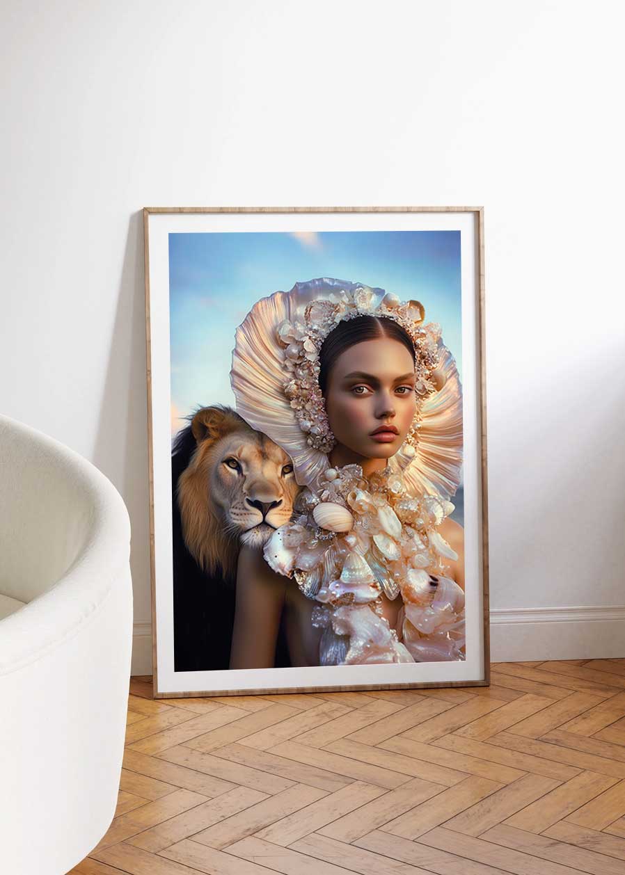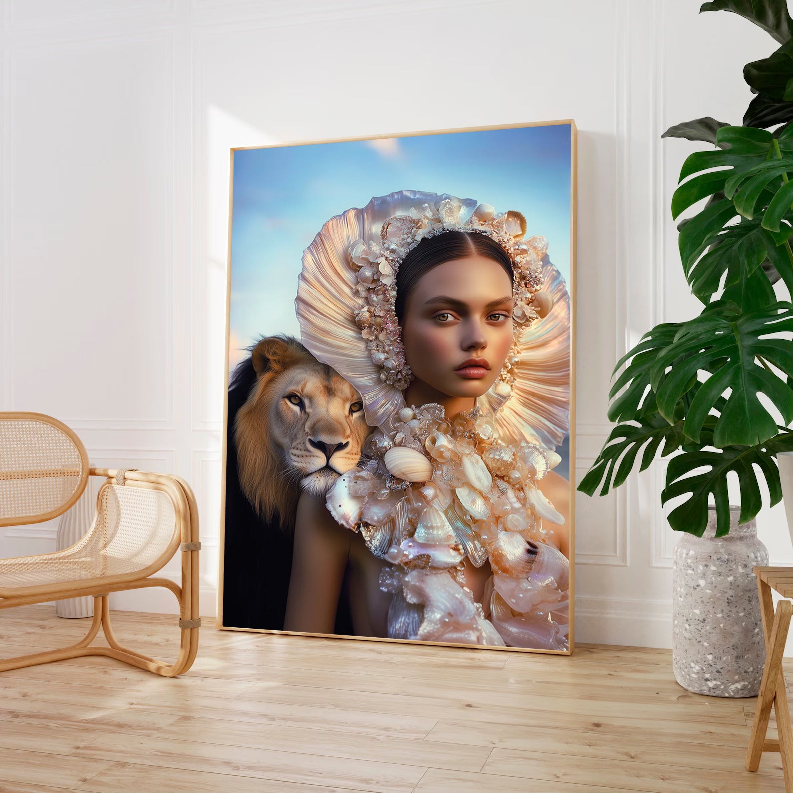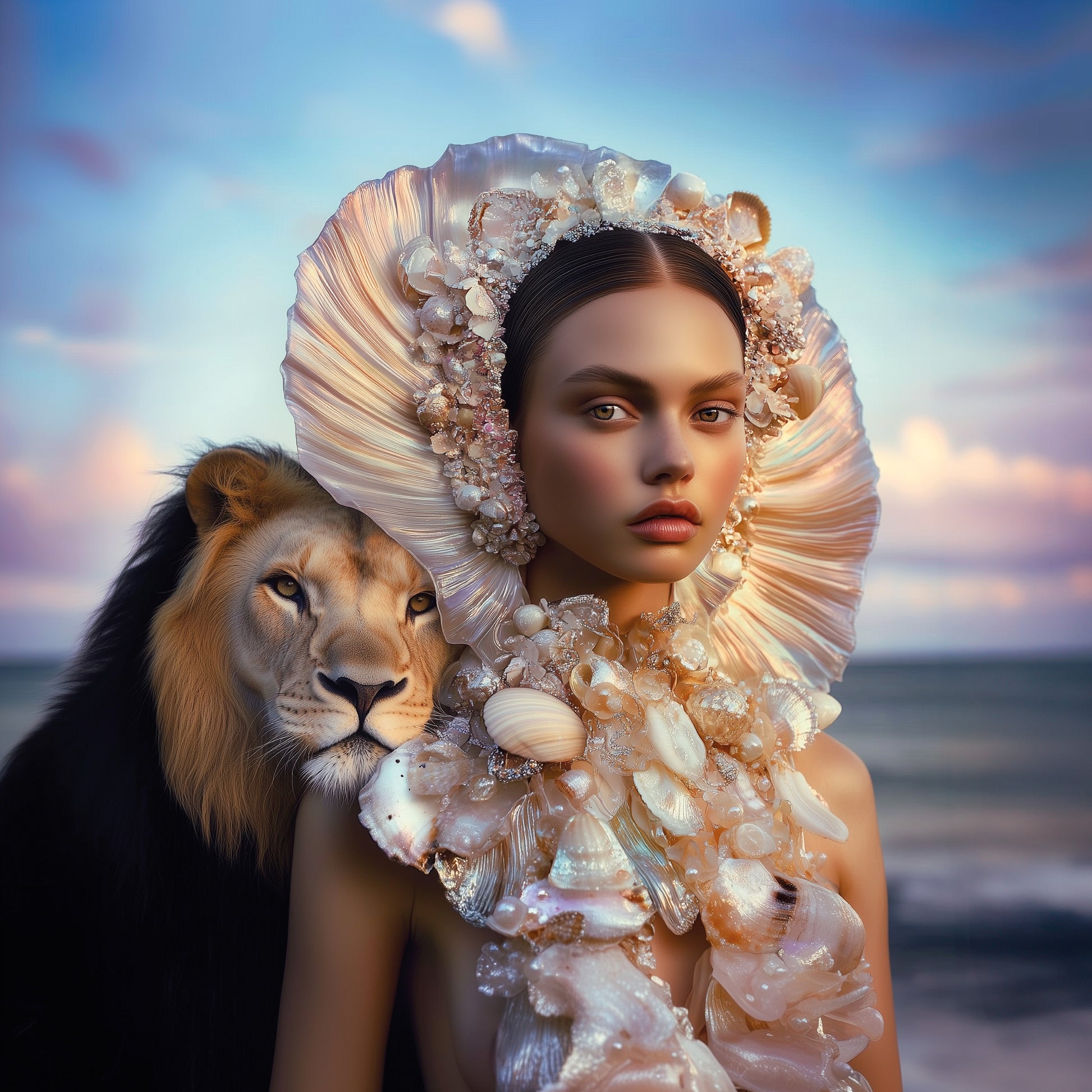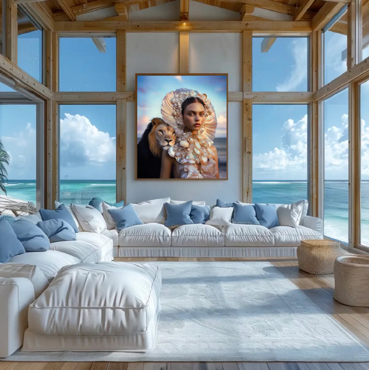 Tanit, the goddess of Ibiza, embodies nature, fertility, and protection. Her fierce gaze lights up the horizon each evening, while the lion, symbol of strength and courage, walks by her side. Together, they guard a kingdom where life and magic intertwine, a reminder of the sacred power that flows through the island, eternal and unyielding.